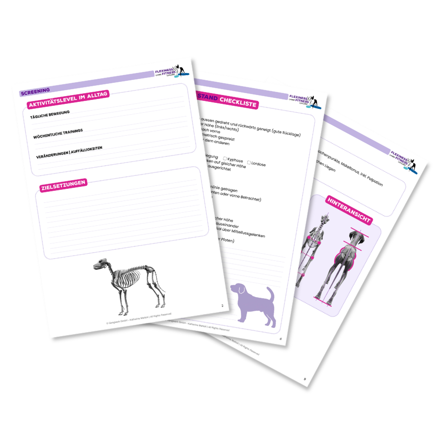 Beim Screening analysieren den aktuellen Zustand (Haltung, Kraft, Stabilität, Mobilität, Flexiblität) deines Hundes. Dies ist entscheidend, um präventive Massnahmen zu ergreifen und das Training optimal anzupassen.